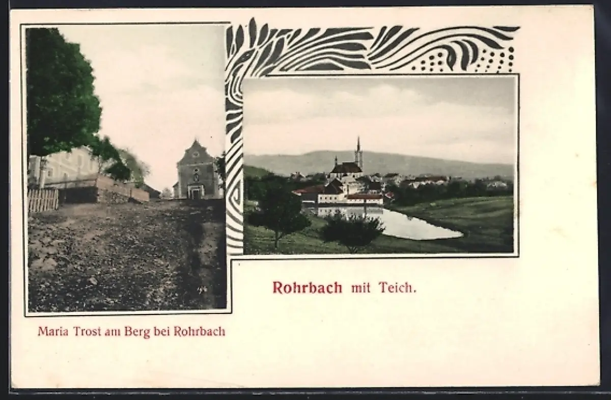 AK Rohrbach-Berg, Kirche Maria Trost am Berg, Ortsansicht mit Teich