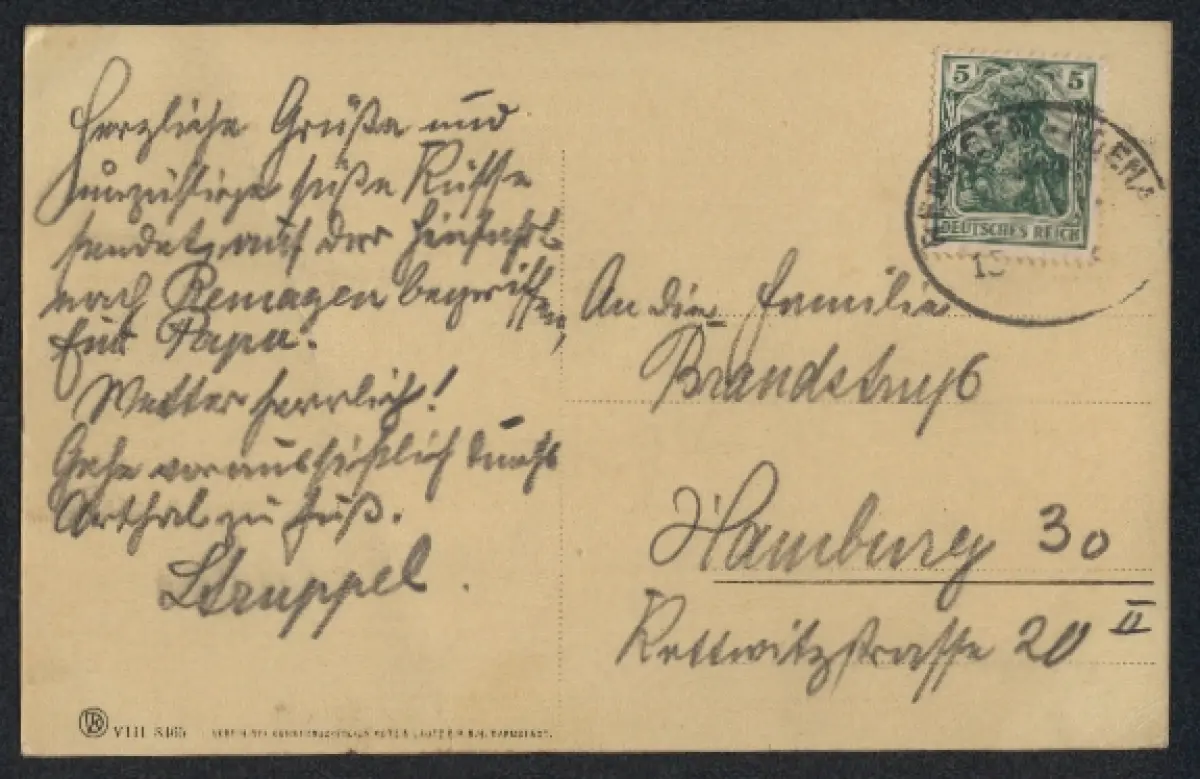 Personenbezogene Daten auf der Rückseite der Karte wurden durch blauen Textmarker unkenntlich gemacht. Die blauen Stellen sind auf die Vorderseite durchgeweicht und wirken sich negativ auf das Postkartenfoto aus