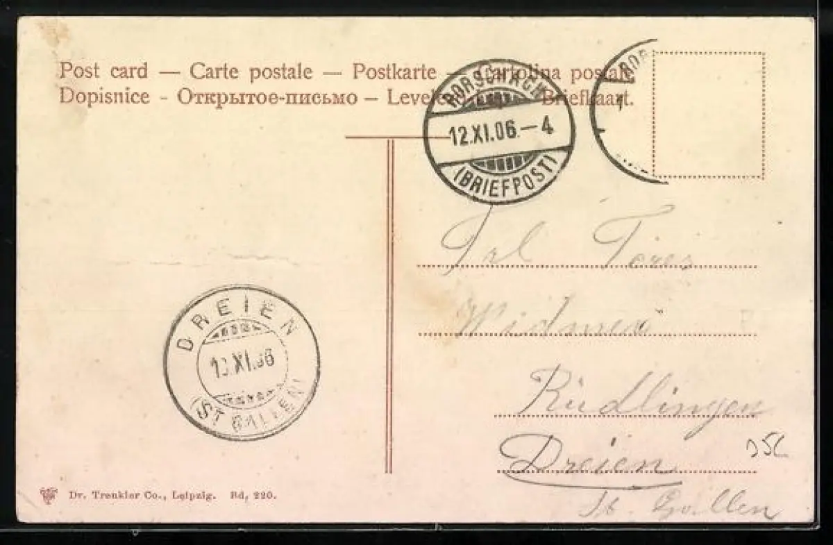 gelaufen 1906, Eckknick re. unten, Briefmarke entfernt, guter Zustand