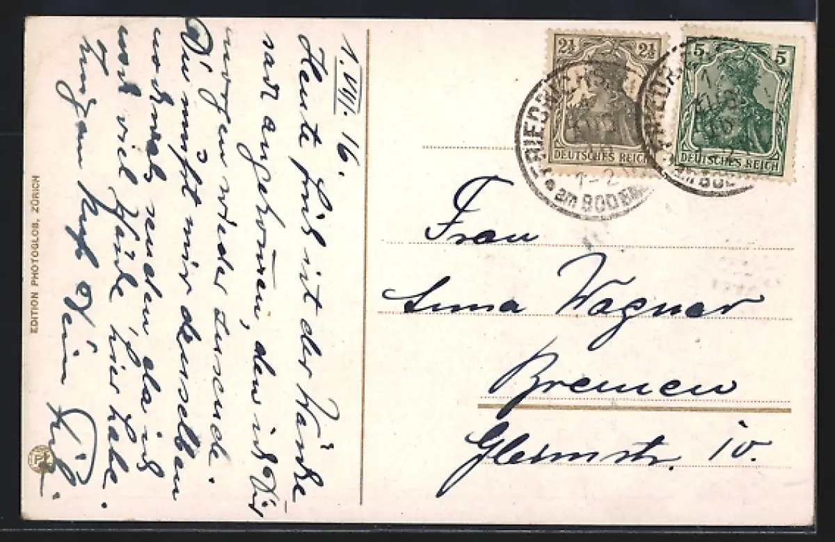 Personenbezogene Daten auf der Rückseite der Karte wurden durch blauen Textmarker unkenntlich gemacht. Die blauen Stellen sind auf die Vorderseite durchgeweicht und wirken sich negativ auf das Postkartenfoto aus