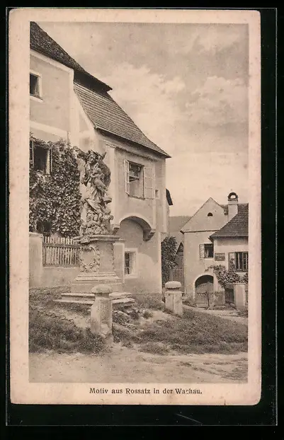 AK Rossatz in der Wachau, Ortspartie mit Denkmal
