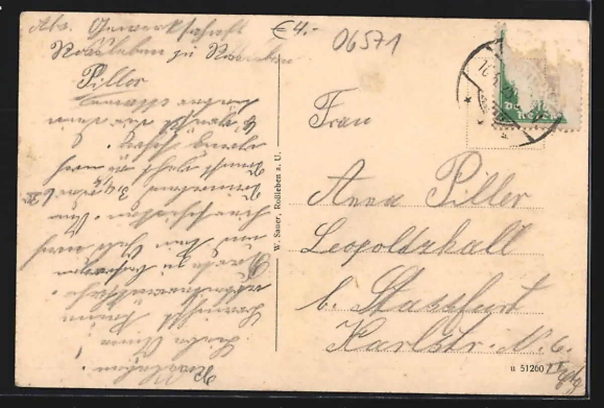 Personenbezogene Daten auf der Rückseite der Karte wurden durch blauen Textmarker unkenntlich gemacht. Die blauen Stellen sind auf die Vorderseite durchgeweicht und wirken sich negativ auf das Postkartenfoto aus