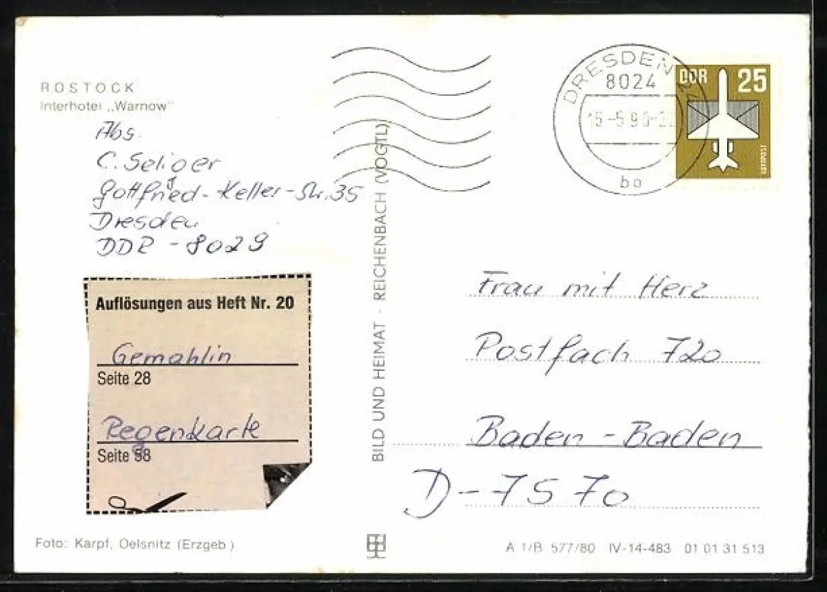gelaufen 1990, rückseitig Klebe- und Papierreste, guter Zustand