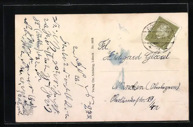 Personenbezogene Daten auf der Rückseite der Karte wurden durch blauen Textmarker unkenntlich gemacht. Die blauen Stellen sind auf die Vorderseite durchgeweicht und wirken sich negativ auf das Postkartenfoto aus