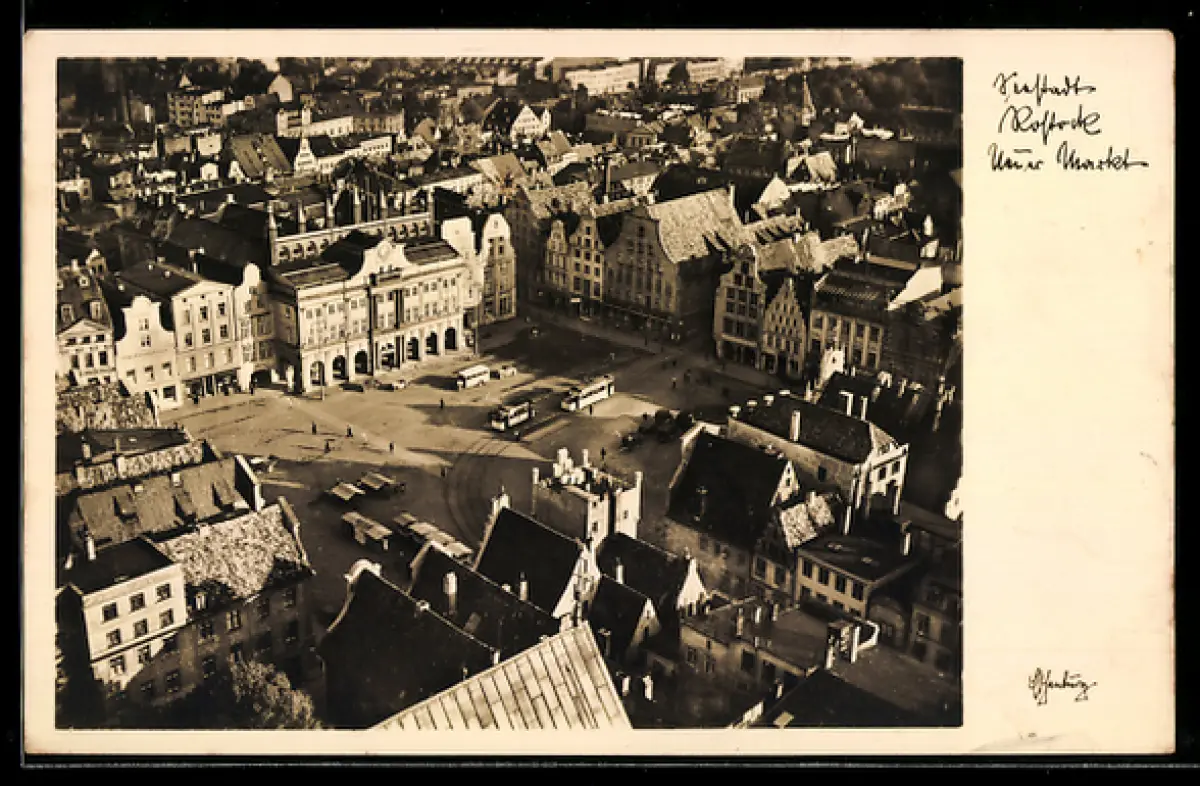 AK Rostock, Neuer Markt und Rathaus aus der Vogelschau