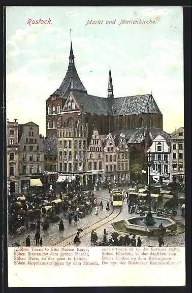 AK Rostock, Strassenbahn und Marienkirche am Markt