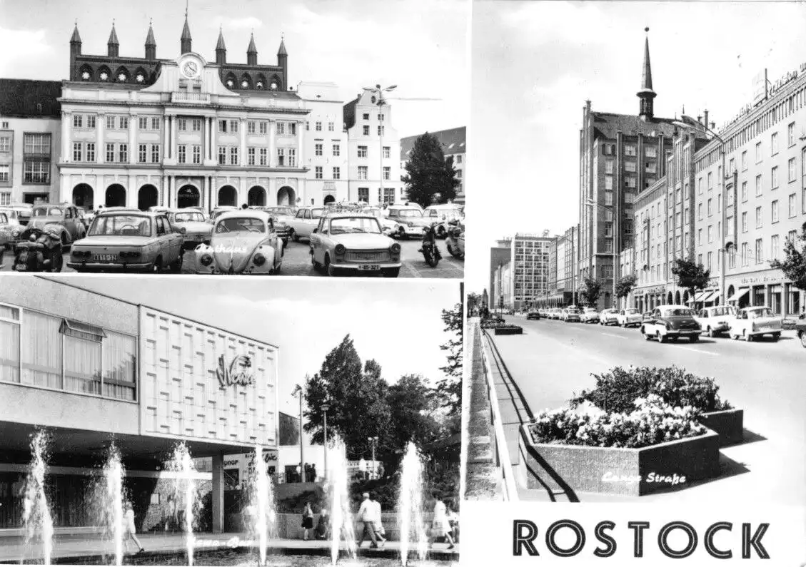 Ansichtskarte Rostock drei Abb. - Rathaus, Newa-Bar, Lange Str. Erhaltung I-II postalisch gelaufen, ungestempelt: Druckvermerk: 1974 Herstellungsland: DDR Verlag: Planet-Verlag Berlin - 02 01 31 162