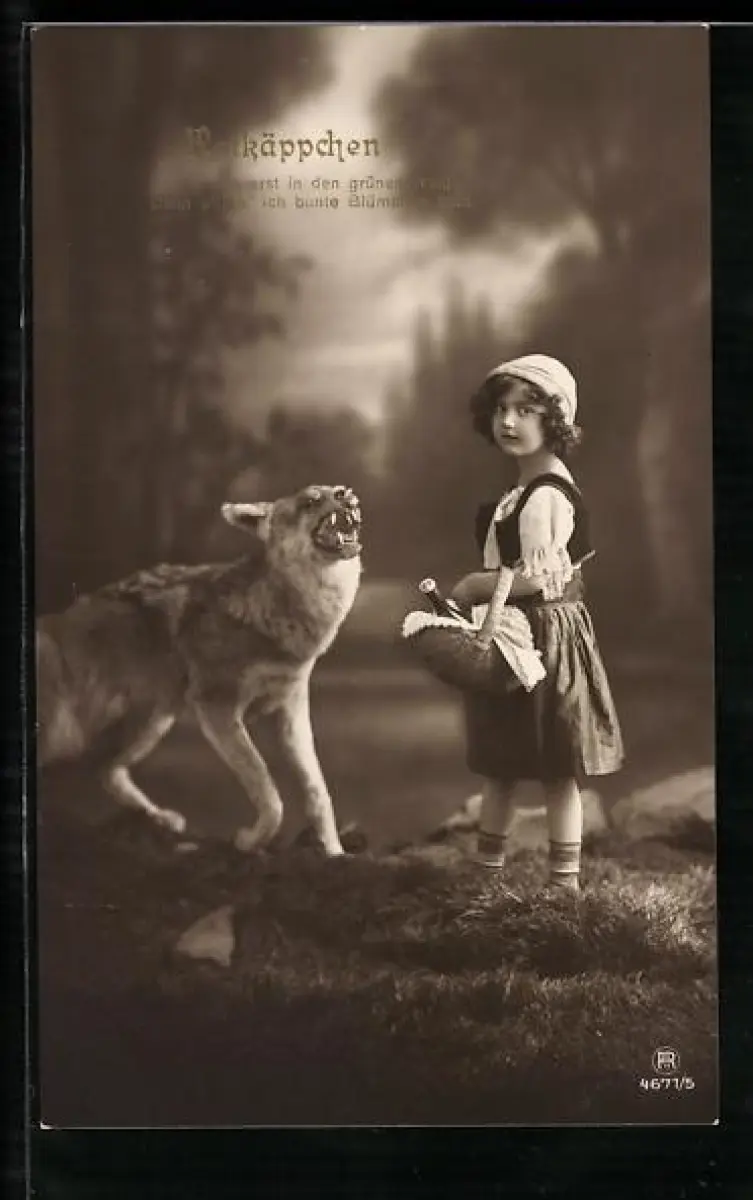 AK Rotkäppchen mit Korb begegnet dem bösen Wolf