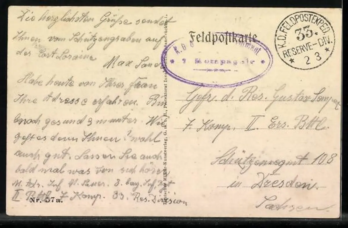 Personenbezogene Daten auf der Rückseite der Karte wurden durch blauen Textmarker unkenntlich gemacht. Die blauen Stellen sind auf die Vorderseite durchgeweicht und wirken sich negativ auf das Postkartenfoto aus