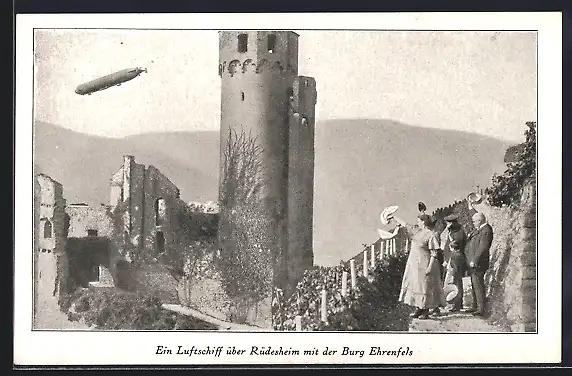 AK Rüdesheim / Rhein, Ein Zeppelin über der Stadt mit Burg Ehrenfels