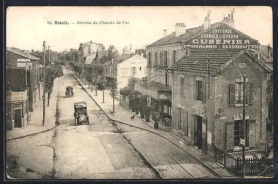 AK Rueil, Avenue du Chemin de Fer avec voitures et bâtiments commerciaux