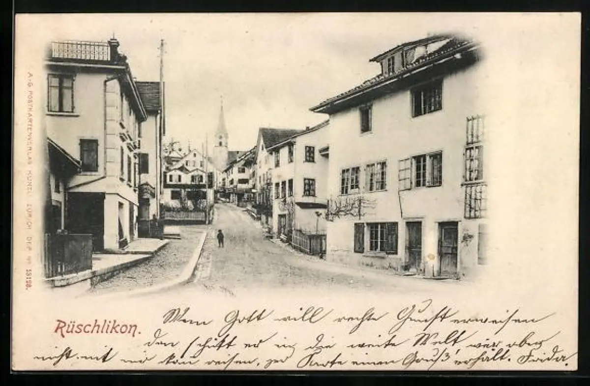 AK Rüschlikon, Strassenpartie mit Blick zur Kirche