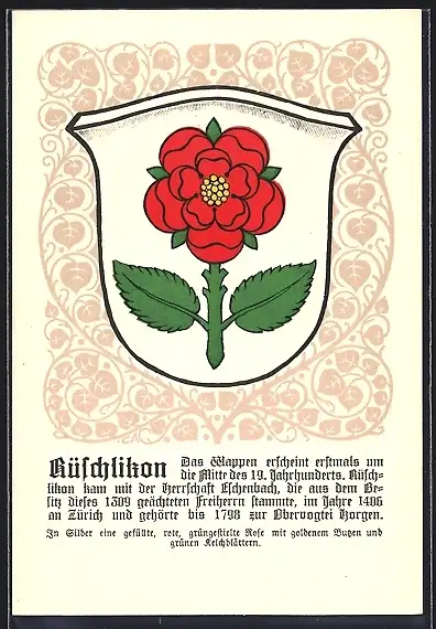 AK Rüschlikon, Wappen auf Blatt-Ornamenten, Info-Text