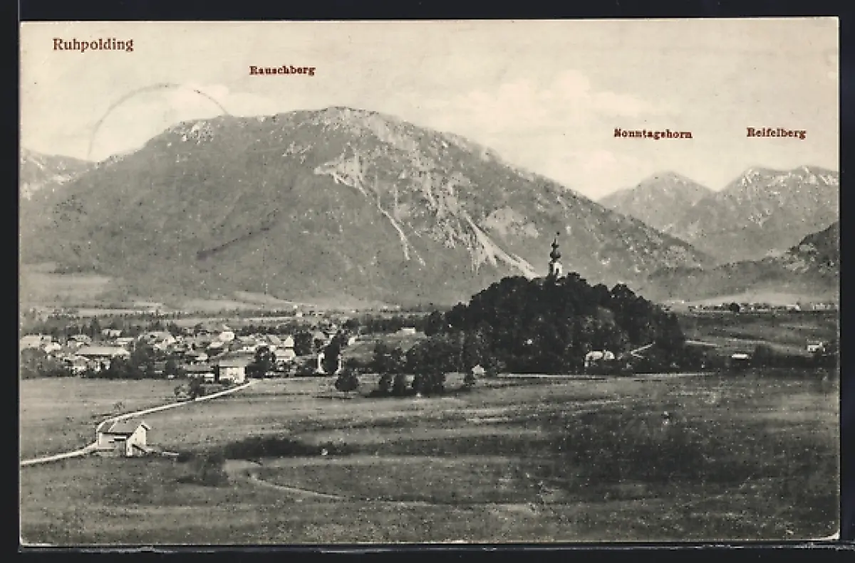 AK Ruhpolding, Blick auf den Ort, Kirche, Rauschberg, Reifelberg