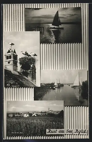AK Rust am See im Burgenland, Ortspanorama, Storchennester, Segelboote