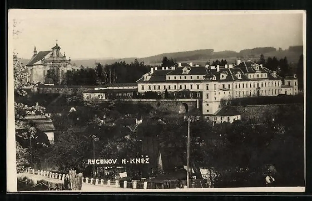 AK Rychnov n. Knez, Teilansicht mit Kirche aus der Vogelschau