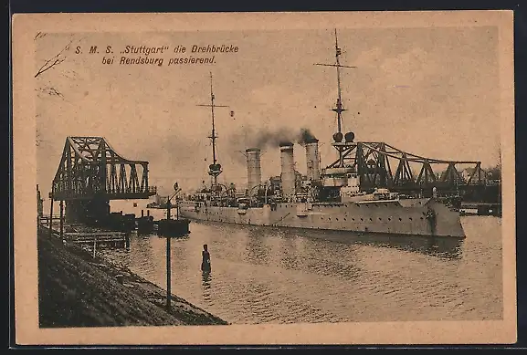AK SMS Kriegsschiff Stuttgart die Drehbrücke bei Rendsburg passierend