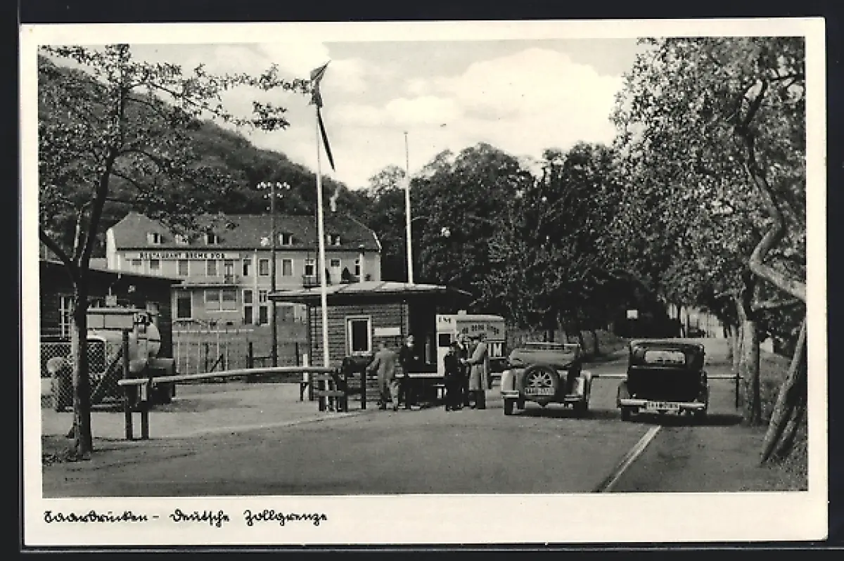 AK Saarbrücken, Goldene Bremm, Zoll-Grenze m. Autos u. Restaurant Breme D'or