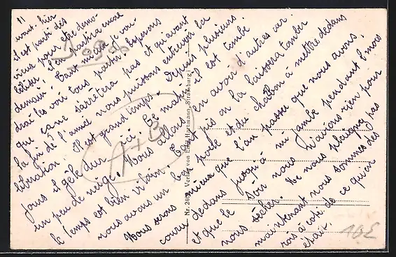 Personenbezogene Daten auf der Rückseite der Karte wurden durch blauen Textmarker unkenntlich gemacht. Die blauen Stellen sind auf die Vorderseite durchgeweicht und wirken sich negativ auf das Postkartenfoto aus