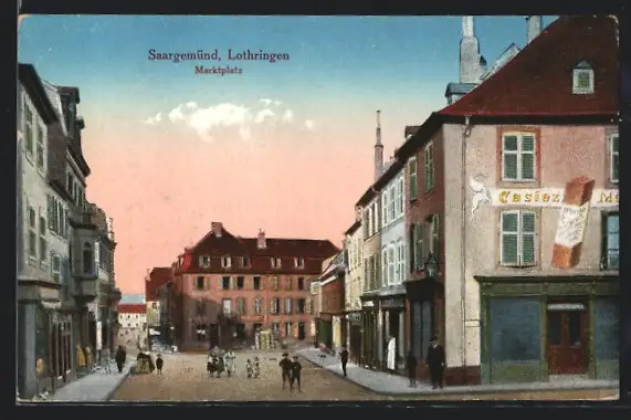 AK Saargemünd /Lothringen, Anblick des Marktplatzes, Reklame an Hauswand