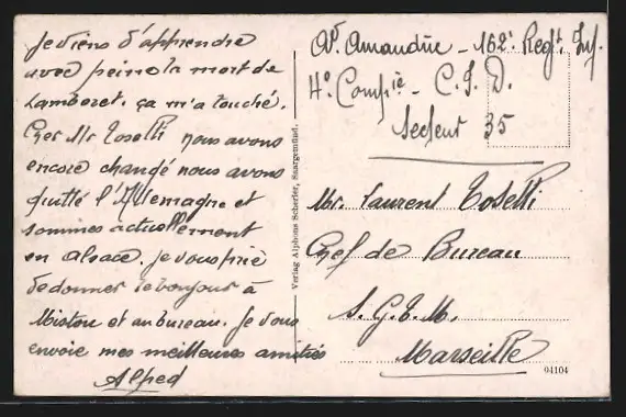 Personenbezogene Daten auf der Rückseite der Karte wurden durch blauen Textmarker unkenntlich gemacht. Die blauen Stellen sind auf die Vorderseite durchgeweicht und wirken sich negativ auf das Postkartenfoto aus