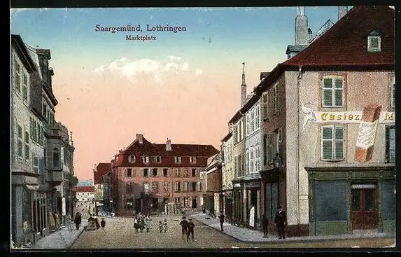 AK Saargemünd /Lothringen, Anblick des Marktplatzes, Reklame an Hauswand