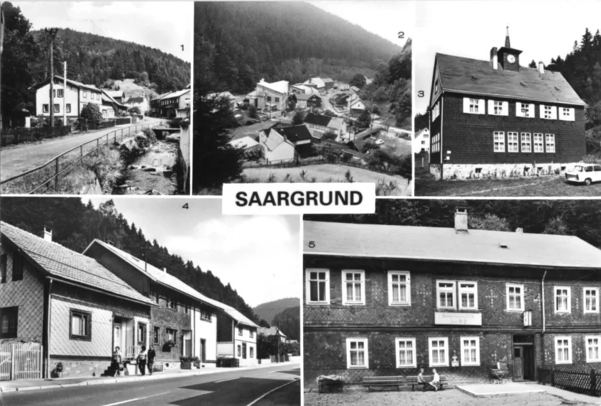 Ansichtskarte Saargrund Kr. Hildburghausen fünf Abb. - Teilansicht, Übersicht, Rat der Gemeinde, Hauptstr., Gaststätte "Zum Bless" Erhaltung I-II, Beförderungsspuren postalisch gelaufen, gestempelt: Eisfeld, 8.11.82 Druckvermerk: 1982 Herstellungsland: DDR Verlag: Bild und Heimat, Reichenbach i. V. - 01 11 02 797