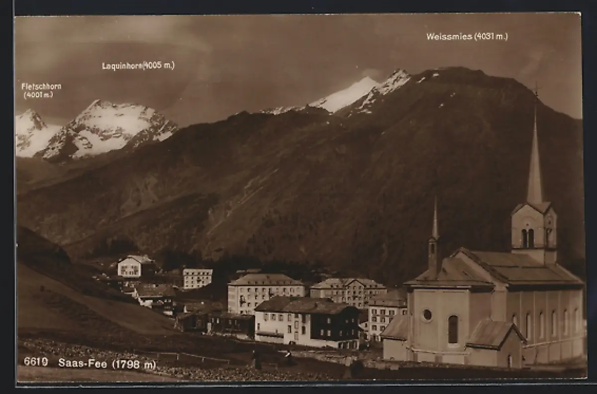 AK Saas-Fee, Kirche mit Weissmies, Laquinhorn und Fletschhorn