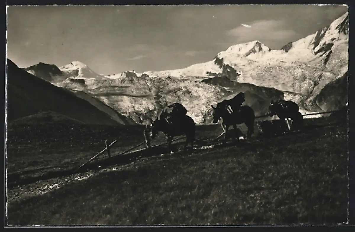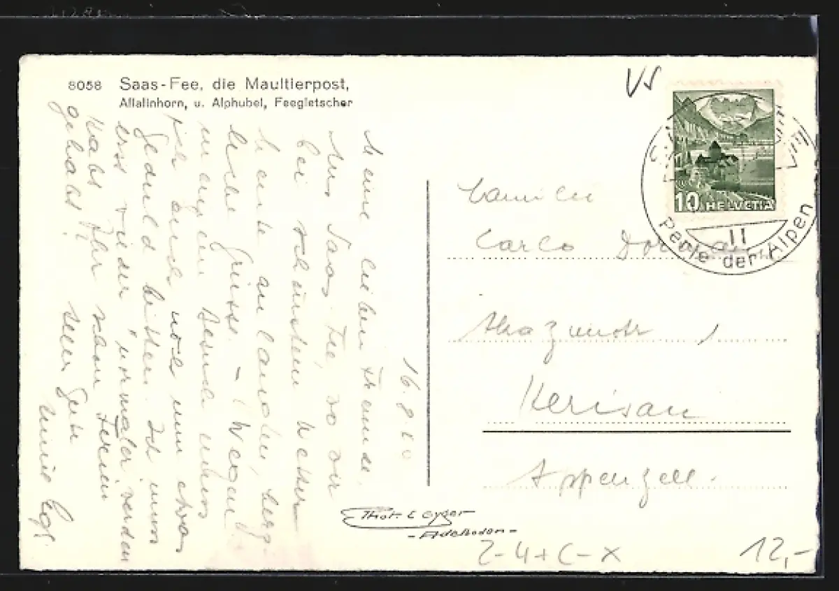 AK Saas-Fée, Maultierpost vor Allalinhorn, Alphubel und Feegletscher