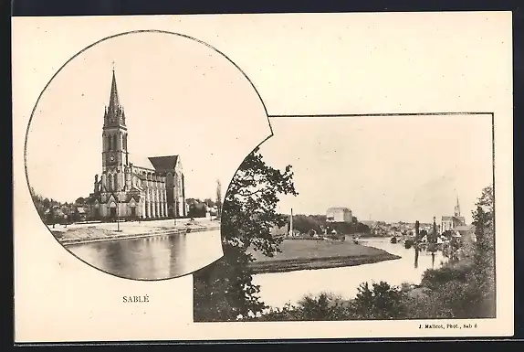 AK Sablé, Vue de l`église et du fleuve avec paysage environnant