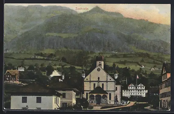 AK Sachseln, Teilansicht mit Kirche u. Bergpanorama