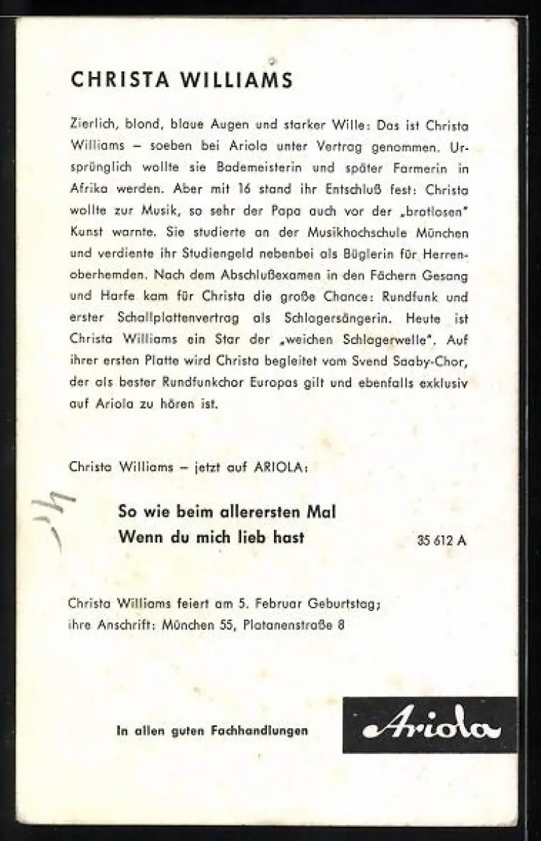 AK Sängerin Christa Williams blickt in die Kamera, Autograph