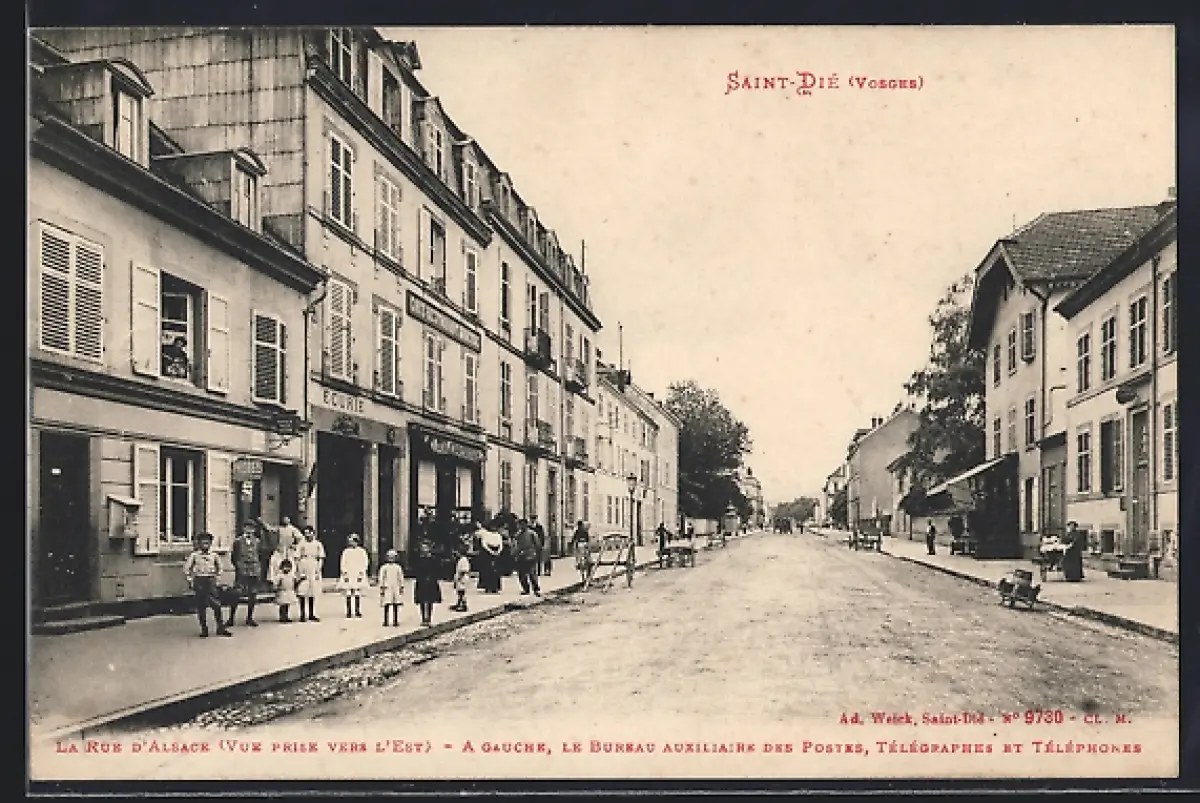 AK Saint-Dié /Vosges, La Rue d`Alsace, vue prise vers l`Est, avec le bureau auxiliaire des postes à gauche
