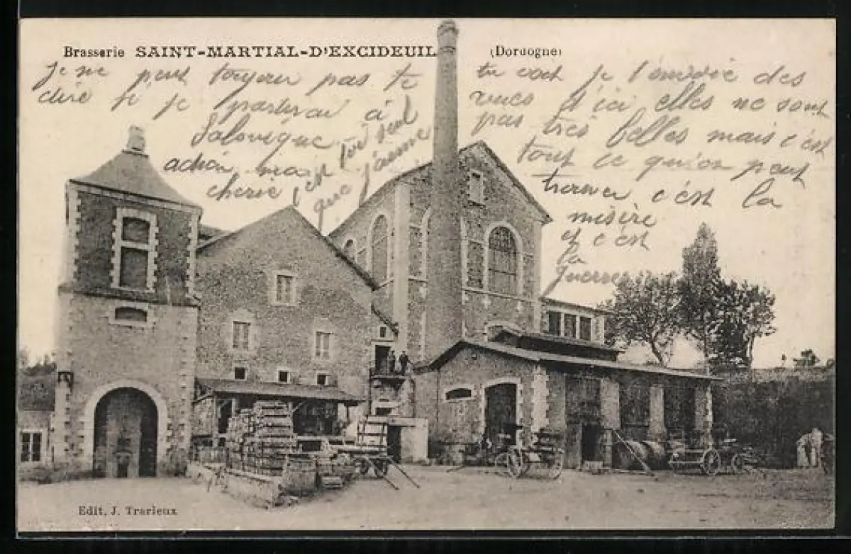 AK Saint-Martial-d`Excideuil /Dordogne, Brasserie avec charrettes et tonneaux devant le bâtiment