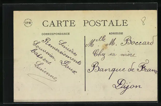 Personenbezogene Daten auf der Rückseite der Karte wurden durch blauen Textmarker unkenntlich gemacht. Die blauen Stellen sind auf die Vorderseite durchgeweicht und wirken sich negativ auf das Postkartenfoto aus