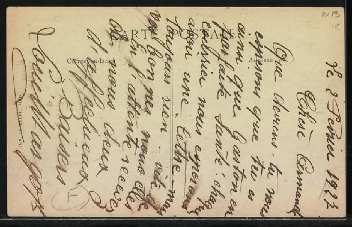Personenbezogene Daten auf der Rückseite der Karte wurden durch blauen Textmarker unkenntlich gemacht. Die blauen Stellen sind auf die Vorderseite durchgeweicht und wirken sich negativ auf das Postkartenfoto aus