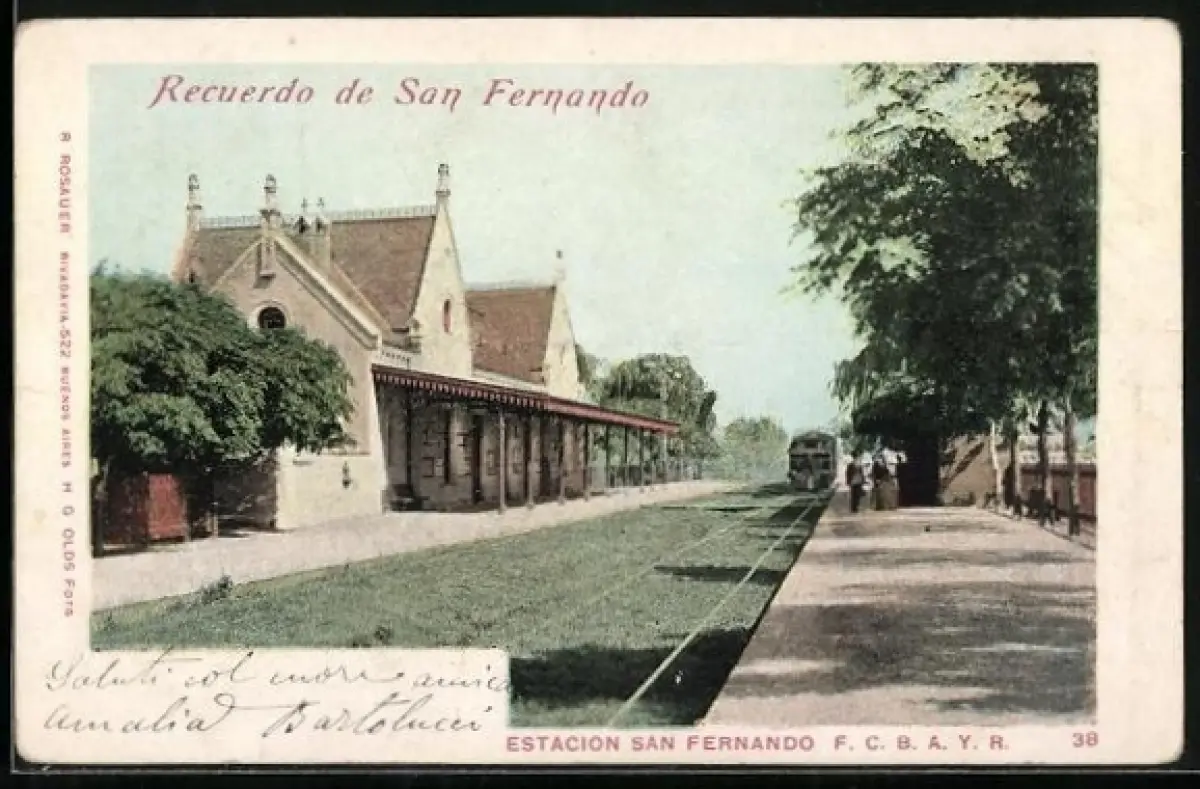 AK San Fernando, Estacion San Fernando F. C. B. A. Y. R. con un tren, Bahnhof
