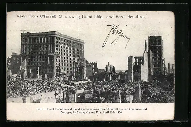 AK San Francisco /Cal., Hotel Hamilton and Flood Building, destroyed by Earthquake April 18th 1906