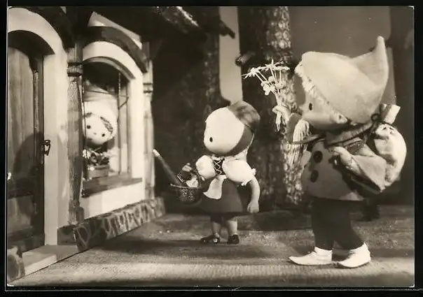 AK Sandmännchen mit Rotkäppchen verabschiedet sich von der Grossmutter