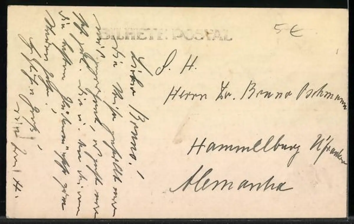 Personenbezogene Daten auf der Rückseite der Karte wurden durch blauen Textmarker unkenntlich gemacht. Die blauen Stellen sind auf die Vorderseite durchgeweicht und wirken sich negativ auf das Postkartenfoto aus