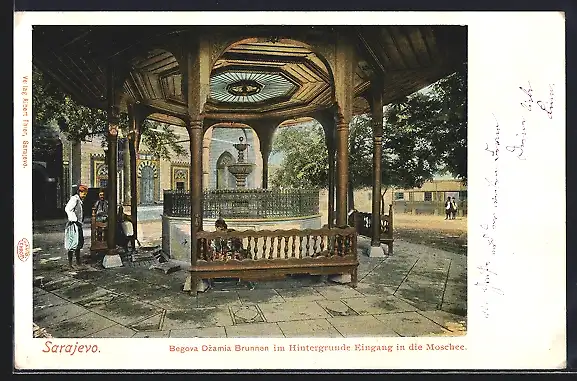 AK Sarajewo, Begova Dzamia Brunnen, im Hintergrund Eingang in die Moschee