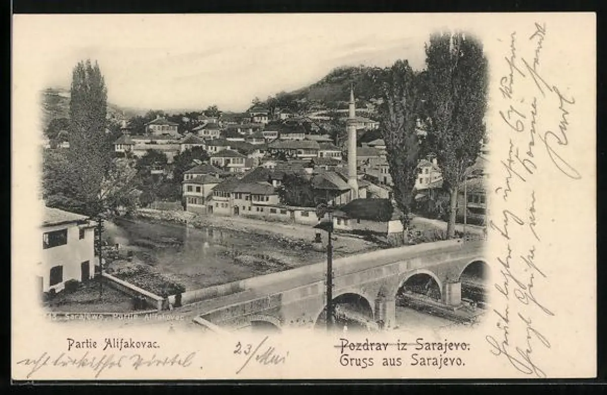 AK Sarajewo, Partie Alifakovac, Ortsansicht mit Flussbrücke