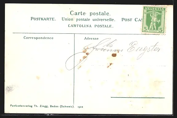 Personenbezogene Daten auf der Rückseite der Karte wurden durch blauen Textmarker unkenntlich gemacht. Die blauen Stellen sind auf die Vorderseite durchgeweicht und wirken sich negativ auf das Postkartenfoto aus
