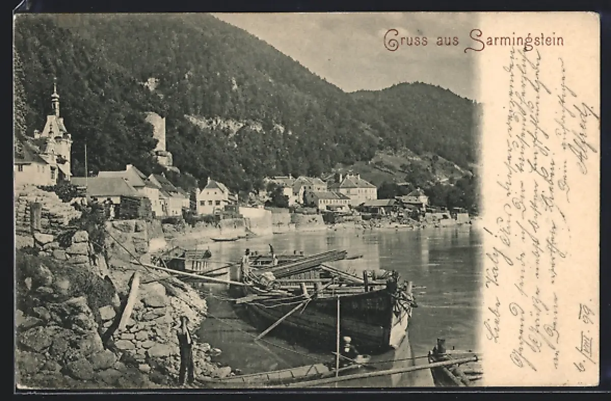 AK Sarmingstein, Ortsansicht, Binnenschiff
