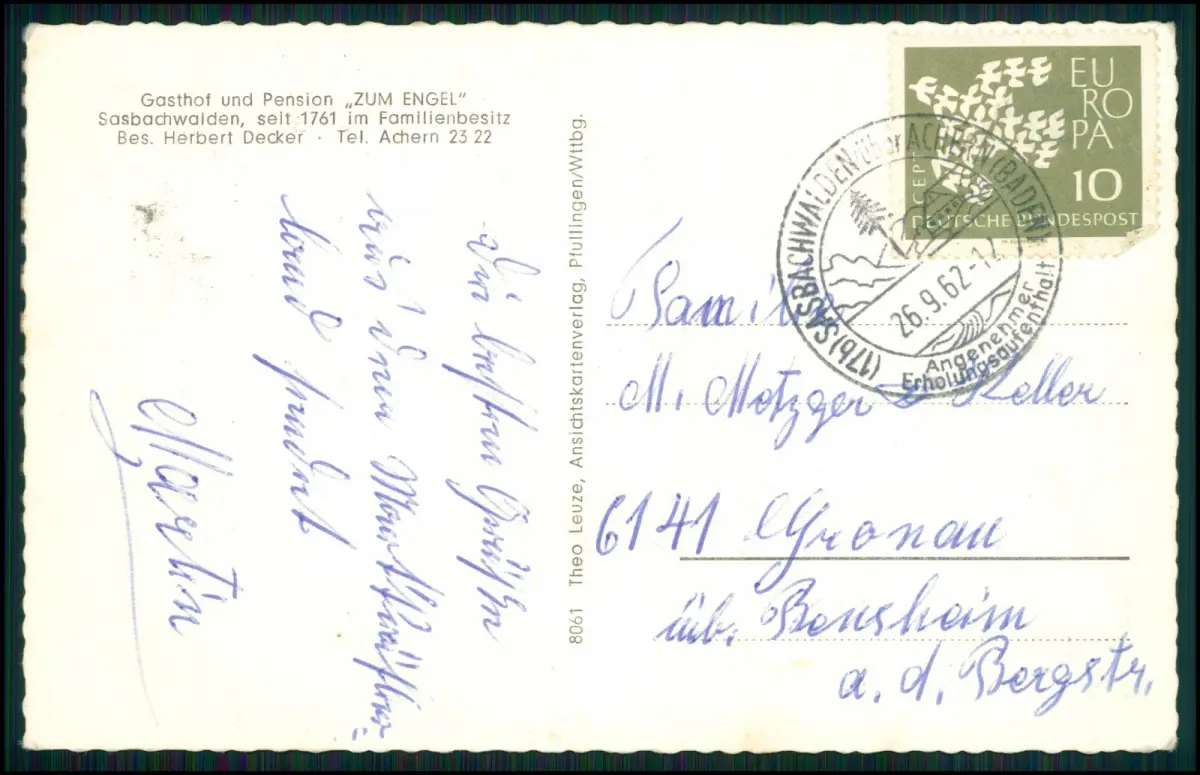 AK, Ansichtskarte, Sasbachwalden, Gasthof Zum Engel, Schwarzwald, Baden-Württemberg, Deutschland, Fachwerkhaus, Pension, Hotel, Gasthof, historische Postkarte, kolorierte Karte, gelaufen 1962, Theo Leuze, Achern.......BITTE BEACHTEN SIE: Beim Kauf von mehreren Artikeln NICHT sofort die Kaufabwicklung abschließen ? ganz wichtig! Nur dann kann eine zusammengefasste Rechnung mit nur einmal Porto an Sie über Ebay gesendet werden!!!
