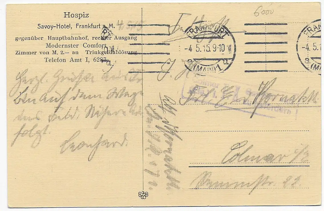 AK Savoy Hotel in Frankfurt/Main 1915 nach Colmar