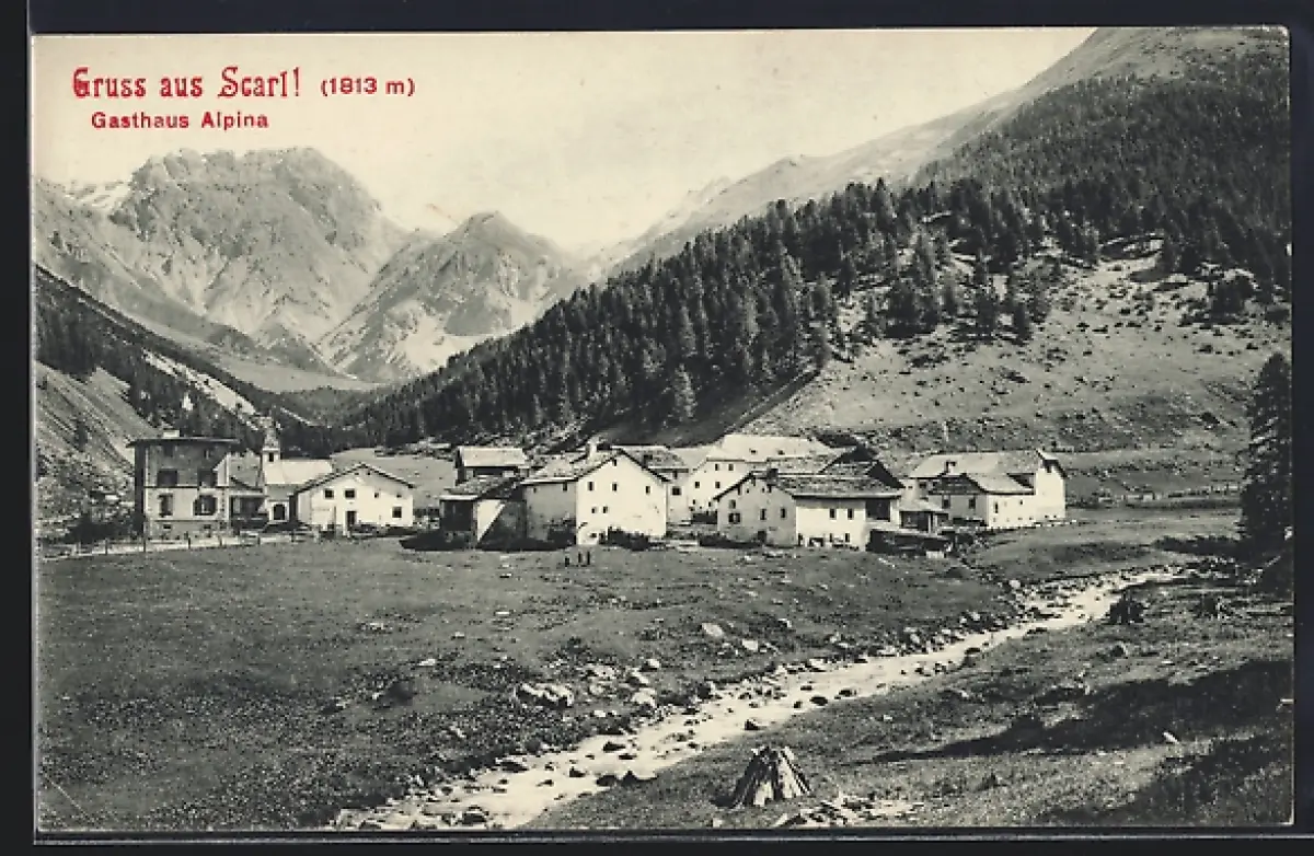 AK Scarl, Ortsansicht mit Gasthaus Alpina