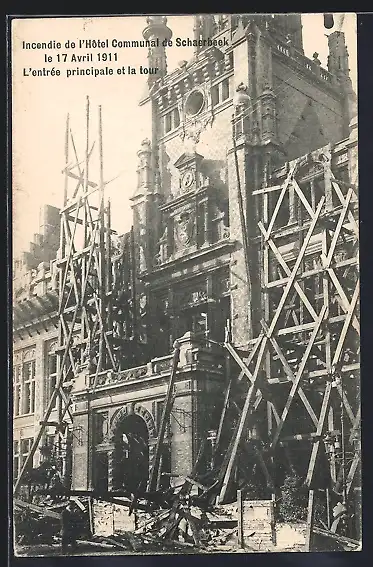 AK Schaerbeek, Incendie de l`Hotel Communal 1911, L`entree principale et la tour