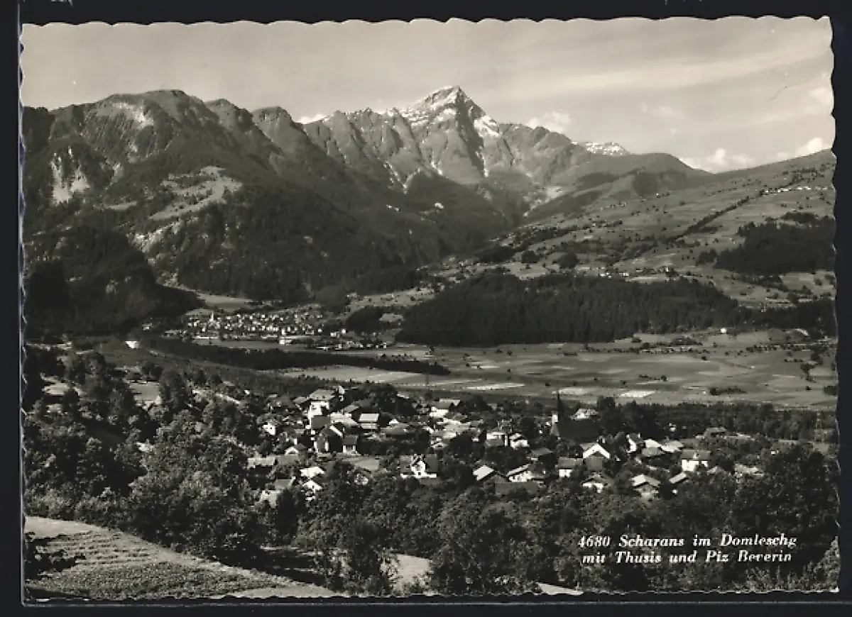 AK Scharans im Domleschg, Ortsansicht mit Thusis und Piz Beverin
