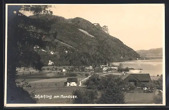 AK Scharfling am Mondsee, Ortsansicht mit Seeblick u. Bergpanorama